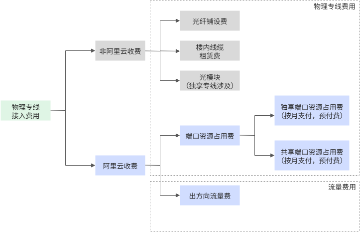 服务商主要收取的是物理专线的网络传输费用,这个按照带宽大小对应不同的价格,公有云厂商主要收取端口占用费用以及出云方向的流量费,端口费是预付费,即资源推送至账户后就会提示需要付费,而流量费是后付费,按照当月出云流量计费