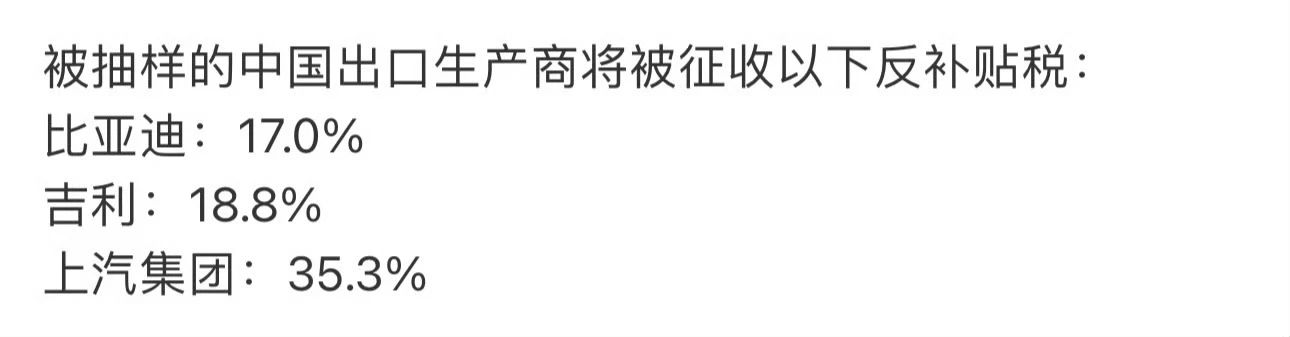 在原有10%关税的基础上,被抽样的中国出口生产商将被加征不同税率的关税。其中,上汽集团的最高,为35.3%,吉利为18.8%,比亚迪为17%;其他合作公司将被征收20.7%的关税。在提出个别审查请求后,特斯拉将被征收7.8%的关税。所有其他不合作的公司将被征收35.3%的关税。2024年7月4日对从中国进口的电动汽车征收的临时关税将不予征收。