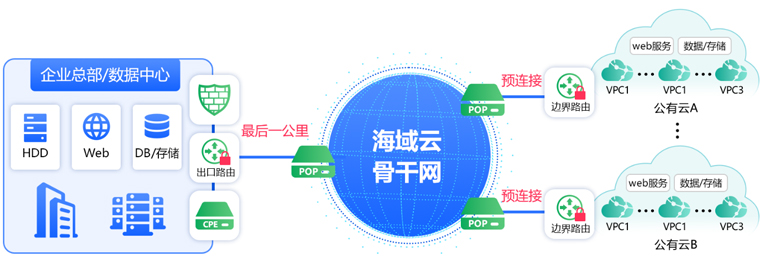 海域云基于SD-WAN技术与跨境运营商合作,实现中美两地AWS资源的内网级互联。
