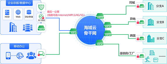 通过在企业总部、分支、数据中心等地部署海域云CPE设备或VCPE,经本地Internet/MPLS专线/4G/5G等多种类型链路就近接入海域云骨干网,从而实现各办公子网间的加速互联互通。移动办公用户则可通过海域云软件客户端进行接入访问内网。