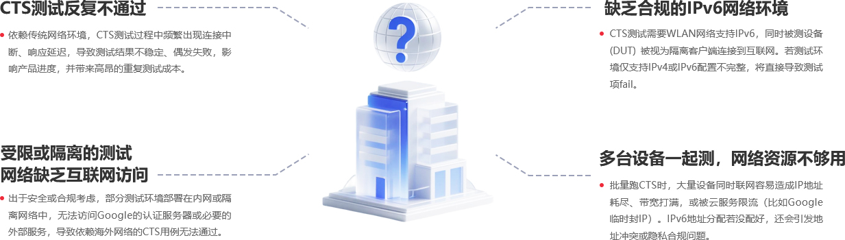 依赖传统网络环境,CTS测试过程中频繁出现连接中断、响应延迟,导致测试结果不稳定、偶发失败,影响产品进度,并带来高昂的重复测试成本。