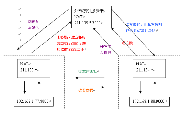 2. NAT网络地址转换:如下,不知道对方地址,所以通过向对方发探测包,向索引服务器转发反馈包的方式获取目标地址的过程;但由于国内网络环境复杂,如电信、联通、移动、安卓、IOS等区分,有时候NAT不通,如路由器便具备NAT功能;
